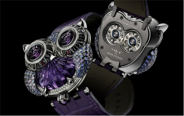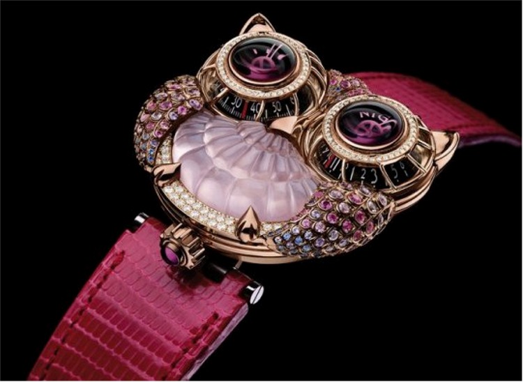 Solid gold renditions include amethyst and violet sapphires with diamonds, or 18-karat rose gold with pink sapphires, pink tourmalines, rose quartz and diamonds. MB&F has placed the rotor beneath the center faceted stone of the owl – so it looks a though the bird’s feathers are ruffling or heart is beating with every turn of the rotor. Naturally – these pieces are created in extremely limited numbers. It would be a shame to miss out on this Owlish delight. Of course, one has to be able to shell out approximatley $215,000. Still — Kudos to MB&F and Max Busser