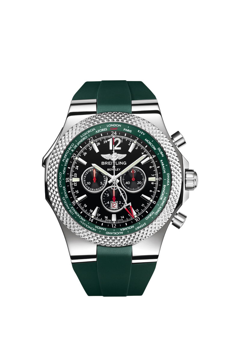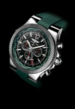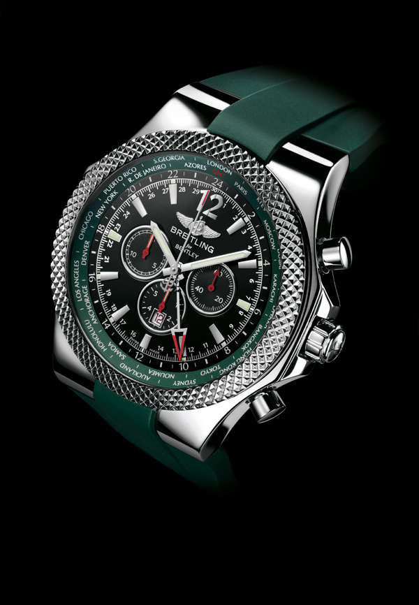 Created in celebration of Bentley’s launch of the powerful Continental GT coupé, Breitling for Bentley takes o the road with this exclusive1,000-piece version distinguished by a racing green inner bezel and rubber strap. The multiple time zone watch houses the Breitling Calibre 47B COSC-certified chronometer with chronograph that times to 1/8th of a second, and offers 6-hour, 15-minute and 30-second totalizes. The 24-hour second time zone is indicated with a red hand and there is a 24-city time zone scale on the inner chapter ring of British Racing Green. The second time zone is adjustable via pushpiece integrated into the left side of the case. The watch, which also offers a calendar, is water resistant to 100 meters. The watch is also available with a black rubber strap for those less daring souls. It retails for $9,275.