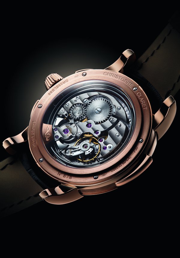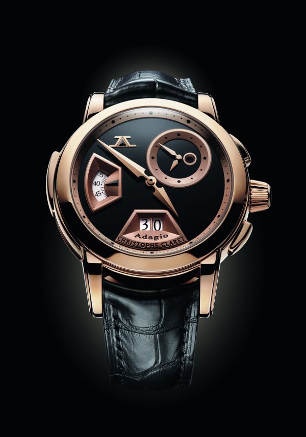 Now, on the heels of the bold, square, stealth Dual Tow, Claret spins off to something a bit more classical – yet just as complicated. In Geneva recently, he unveiled the one-year-in-the-making Adagio, a GMT Minute Repeater. The repeater strikes the hours, quarts and minutes on demand with cathedral gongs fitted into a patented device that prevents them from knocking against each other when they vibrate under the hammer blows. The complex watch offers central hour and minute hands, big seconds disk at 9:00, a patented