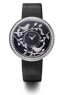 In typical Piaget style, whimsy and haute Joaillerie marry with perfection in the newest Limelight series – a Garden Party, complete with outdoor nature elements. The newest Limelight Dancing Light watch is a magnificent delight — set with 165 diamonds in what is lovingly referred to as the Happy Bird motif. The black dial of this watch features two 18-karat white gold, diamond-set rotating birds sitting on diamond-set leaves. The case is also set with diamonds, for a total of 165 gems. Of course, it is matched by an entire suite of entrancing Happy Bird Limelight Dancing Light jewelry. While the birds don’t sing – they may as well… the watch is so entrancing – it nearly has its onlookers singing.