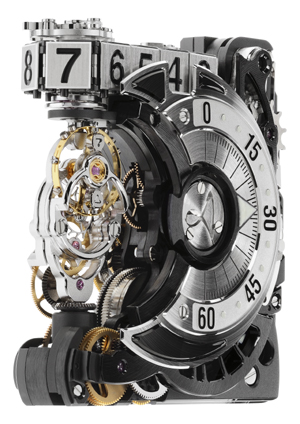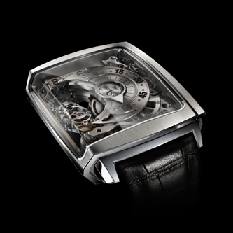 The watch holds three patents, offers a retrograde minute indication (the minute hand moves from 0 to 60 and then returns back to 0 to start its count again) and a numeric (digit) jump hour indicator (which actually moves on a chain link that slides sideways in our increments to reveal each new hour). The movement is made in-house by Hautlence. The TV-screen case features a sapphire crystal that wraps around the side for a more revealing look inside. HL2.0 retails for $200,000 in rose gold and $219,000 in white gold.