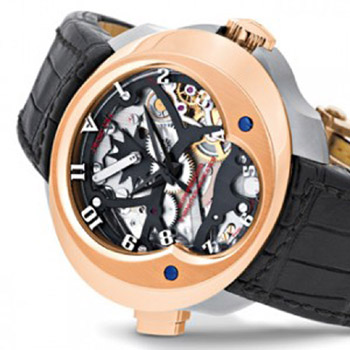 Soaring onto the scenes, this newest bold beauty comes from Franc Vila: the FVa35 Supersonico 5-Minute Repeater. The titanium and 18-karat red gold watch features movement bridges made of aeronautical high-tech materials such as lightnium and aluminium all visible through the case crystal. Created in a limited edition of 88 pieces, the watch offers minute repeater function and is a superb combination of technical advancement and watchmaking prowess. The absence of the dial makes this a wonderful work of art and mesmerizing tracker of time.