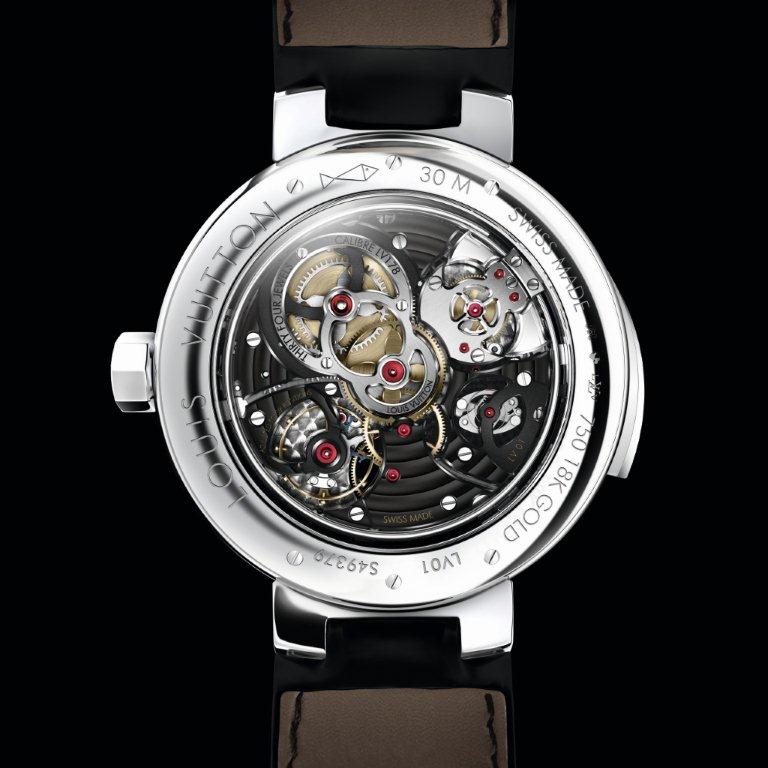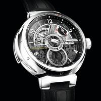 futuristic design offers a well-appointed design visible through a sapphire caseback, too. Blackened bridges, and a LV plate beneath 4:00 that can be customized are just a few key points. The watch, which should retail for around $300,000, was one year in the development stages, and is the work of the dream team of Louis Vuitton and the masters behind the famed Spin Time watch. More details will follow soon.