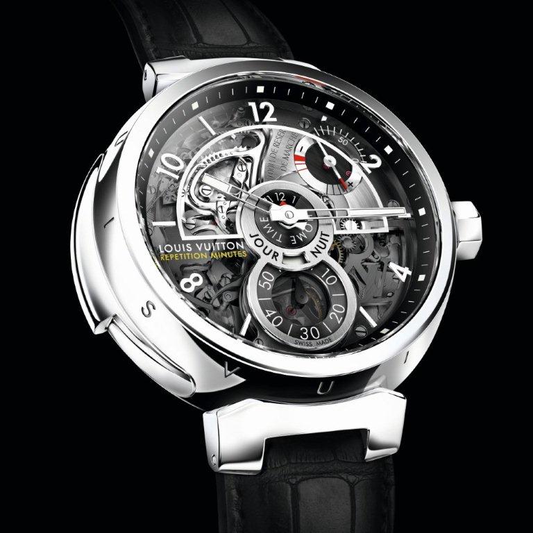 Although it won’t be available until late November of this year — and it is only being created first in a limited edition and then on demand — this amazing new Louis Vuitton minute repeater, dual time-zone watch by Louis Vuitton has gusto and powerful appeal. Unveiled here at BaselWorld, the watch offers – on demand – the hours, quarter hours and minutes and is beautifully ornamented — revealing the works via a sapphire crystal and dial-less front. The