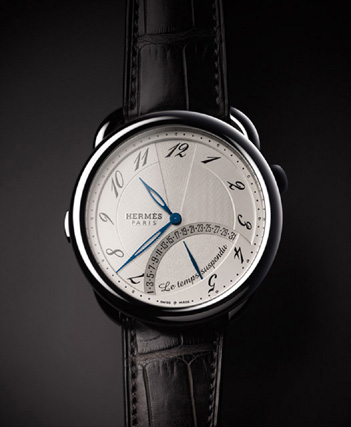 of the most original unveilings of BaselWorld 2011 is the Time Suspended watch by Hermes — developed by well-known watchmaker Jean-Marc Wiederrecht. A classic beauty at first glance, with a retrograde date indication in arc format across the lower portion of the dial, the watch is a true surpriser. Closer inspection reveals the timepiece’s true abilities – to suspend the tracking of time – to stop time visually. In fact, the watch operates via a triple retrograde system. By simply pressing a pushbutton, the wearer stops the hour and minute hands, which are then relocated to a space near 12:00 (as though they don’t exist). Even the date hand disappears. Inside, the watch continues to keep perfect time, but outwardly – there is not tracking of the moments. Yet, with the press on the pushbutton, the hands begin running again at the correct time, and the date instantly appears again – correctly, of course. So if you’ve got something you want to enjoy doing and don’t want to keep glancing at the time speeding by – suspend that passing of time – for a few hours or a day or so …. it will be there when you are ready. The watch concept started four years ago with the idea of “stopping time” and ended with this winner. Bravo!!