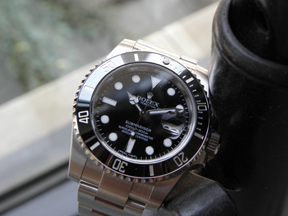 This Rolex Oyster Perpetual Submariner Date is crafted in stainless steel and is a COSC-certified chronometer. The bold iconic piece is pressure proof and water resistant up to 1,000 feet. The superlative piece is substantive on the wrist, looks and feels great and carries a relatively sporty price of $8,000.