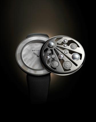 Bulgari, a brand we love to cover, is magnificently versed in creating stunning jewelry and great timepieces. Its Mediterranean Garden of Eden series is a perfect blend of both haute joaillerie and watchmaking. The three watches in the series are hidden, or secret timepieces. Each features a decorative gem set case cover that – when closed – makes the 18-karat gold watch the perfect jewelry statement. Slide the cover aside to reveal the beautiful dial beneath. In the new book, Jewels of Time, Roberta Naas features the stunning multi-colored gem set version. Here we bring you the elegant pearl- and diamond-set model, complete with stunning mother-of-pearl dial. It is a 40mm beauty with a quartz movement customized for Bulgari. Retailing for $32,800, it is beautiful to look at but even more precious to wear!!