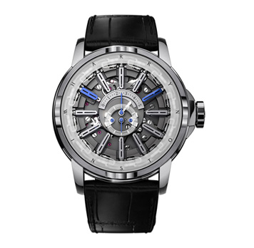 The mechanical movement with manual winding consists of 607 parts, 80 jewels and two barrels – one to owe the turning of the hands and the other for the timing. To perform its magical dance and change of time indication, it consists of 24 hands. The watch offers a power reserve of 45 hours and a retrograde minute display of the elapsed time between each five-minute segment. In fact, on this watch, one can read the minutes so precisely – to the half minute. It also features a seconds hand subdial. It is housed in a 46mm white gold case.