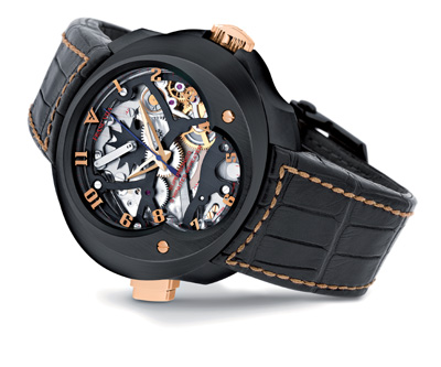 All timepieces in the SuperLigero Concept collection are built using Lightnium, an aluminium-lithium based alloy from the aeronautical engineering field. This alloy is incredibly light weight yet offers extremely high strength – perfect for optimum performance. The inner part of the watchcase is created in this alloy, and transmits the sound to the outer part of the case, which is high-grade blackened titanium. The case shape is the brand’s signature “Esprite Unique” shape with elliptical and circular bezel. The crystal and caseback are both sapphire with double-sided anti-glare treatment, and the watch is water resistant to 100 meters. The repeater pusher is located at 8:00, and with its activation – the watch chimes the time harmoniously with one low frequency chime to indicate the hours and two tone combined chime (low and high frequency) to indicate segments of 5 minutes. The watch is created in a limited edition of just 88 pieces. It retails for a cool $52,000.