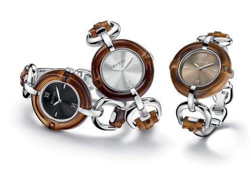 Fashion watches from top designer brands such as Gucci are all the rage now, especially as more and more runways see accessories big for frall. Gucci now brings to light a new Gucci Bamboo Timepiece. This trendy quartz watch features a round case with three dial variations: black, brown, or silver, on a stainless steel and bamboo bangle. Yes – bamboo. What a great material and a great look. The Bamboo is inlaid around the bezel, as well as used in the bracelet. Each timepiece is unique, as it is created individually from each piece of bamboo and hand shaped, before becoming part of the Gucci timepiece. While bamboo is sensitive to water exposure, this is not a watch to be worn swimming – but it is definitely a day to night timepiece! The watch retails for $995.