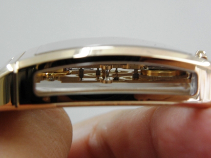 plates and pinions in a row, while the sapphire case back, dial and even case sides allow for an unobstructed view. It’s mesmerizing to look at while on the wrist, and off – and is a real eye catcher with the in-line caliber that seems to be floating in space. The crown is strategically placed on top of the watch case so as not to obstruct any view. It’s a keeper.